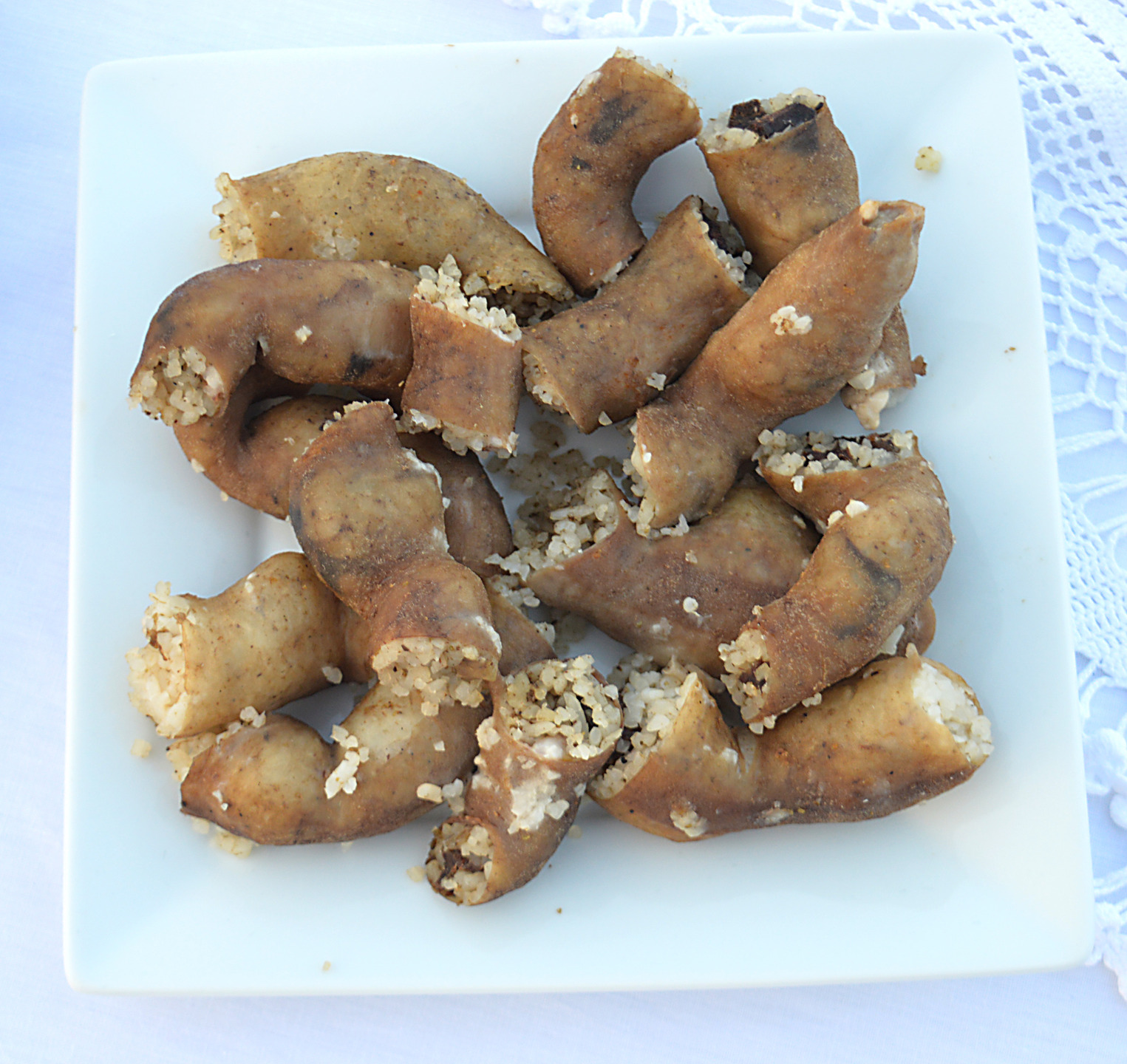 Ιδιαίτερο φαγητό που παραδοσιακά μαγειρεύεται την περίοδο των Χριστουγέννων με τις ρίζες του να κρατάνε από το Βυζάντιο. Πρόκειται για έντερα χοίρου γεμισμένα με πλούσια γέμιση από συκώτι, κνισάρι, ρύζι, σταφίδες, φιστίκια, καρύδια και μπαχαρικά που βράζουν σε νερό. Αφού βράσουν καλά, στραγγίζονται, τηγανίζονται ελαφρώς για να ροδίσουν και πασπαλίζονται με ζάχαρη και κανέλα.