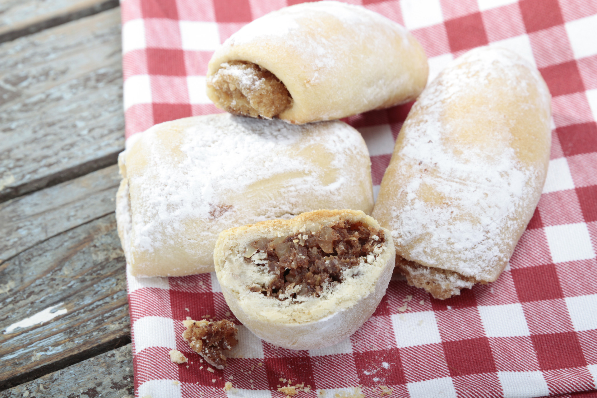Αρωματικά και τραγανά γλυκά ιδανικά για κέρασμα σε γιορτές. Η ζύμη τους πλάθεται με λάδι, κασταλιά (σταχτόνερο), τσίπουρο και βανίλια, ώστε να παραμείνει αφράτη και ελαφριά. Γεμίζονται με καρύδια αρωματισμένα με κανέλα και γαρίφαλο, σε σχήμα μισοφέγγαρου και ψήνονται ώσπου να ροδίσουν. Στο τέλος βουτιούνται σε ελαφρύ σιρόπι και πασπαλίζονται με ζάχαρη άχνη και βανίλια, αποκτώντας λευκή και χιονισμένη όψη, με υπέροχο άρωμα και γεύση.